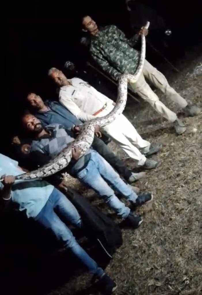 हम आपको बता दें की बीनागंज क्षेत्र के कोटरा बिट के ग्राम भानपुरा भेसुआ के पास शनिवार रात एक अजगर मिलने की जानकारी मिली हमें मिली जानकारी के अनुसार गांव के ही एक किसान संतोष प्रजापति ने अपने खेत पर काम कर रहे थे तभी उन्हें एक अजगर को देखा उसे देखकर मैं घबरा गए और इसकी सूचना उन्होंने गांव वालों को दी गांव वालों ने तत्काल वन विभाग बीनागंज को सूचना दी सूचना मिलने पर रेंजर सौरभ द्विवेदी ने वन विभाग की बीट गॉड अमृतलाल सैनी उनके साथी राजेश भील ,गोविंद मीणा को मौका पर पहुंचा उन्होंने मौके पर पहुंचकर अजगर होने की सूचना रेंजर सौरभ द्विवेदी को दी जिस पर रेंजर सौरभ द्विवेदी के द्वारा राधौगढ़ से अपनी रेस्क्यू टीम को बुलाया 1 घंटे की मेहनत के बाद अजगर को रेस्क्यू किया गया रेस्क्यू टीम के सदस्य दिनेश सैनी ने बताया कि जैसे ही हमको इसकी सूचना मिली हम हमारी पूरी टीम के साथ और पूरी तैयारी के साथ यहां पहुंचे और काफी मशक्कत के बाद हमने 20 किलो बजनी एवं 9 फीट लंबे अजगर को पकड़ा इसकी सूचना हमने रेंजर साहब सौरभ द्विवेदी को दी तथा उनके आदेश पर दूसरे दिन सुबह इसको जंगल में छोड़ा गया